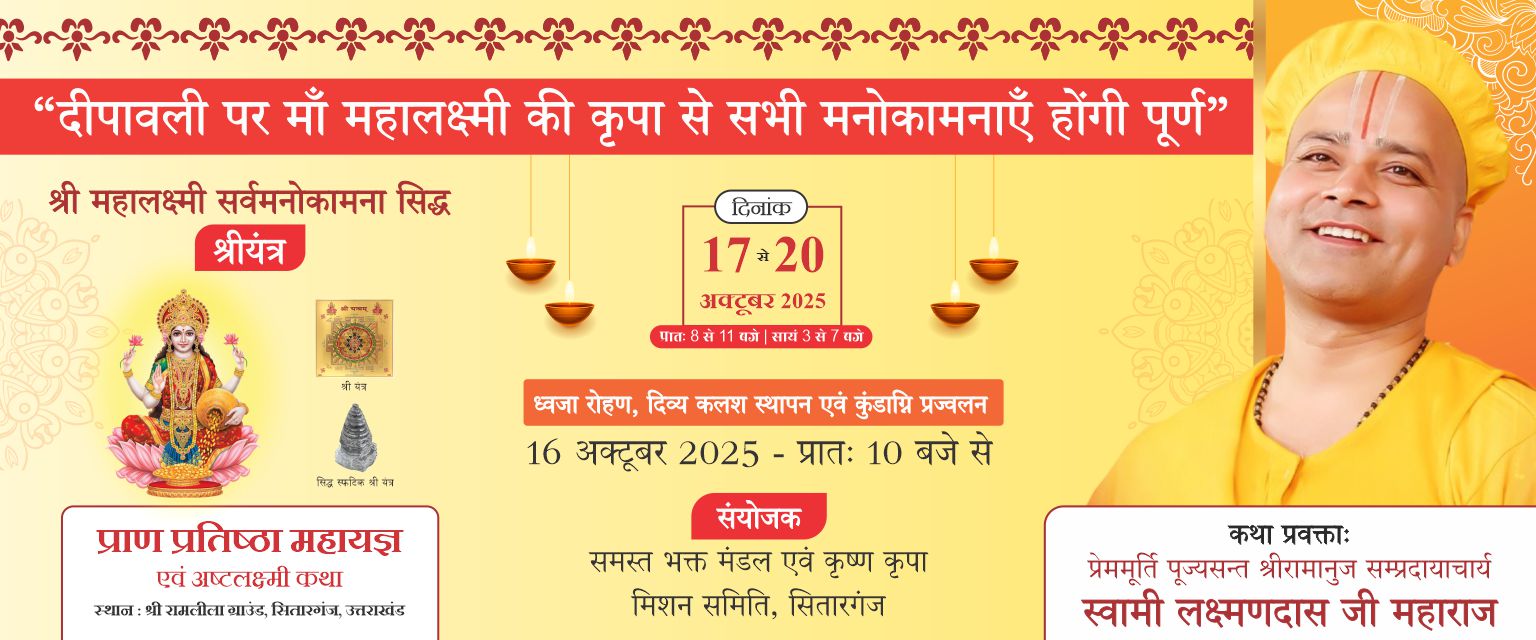धन-वैभव व सुख-संपदा प्राप्ति का पंच दिवसीय ज्योतिर्मय महापर्व "शुभ दीपावली" के अलौकिक अवसर पर “कृष्ण कृपा मिशन चैरिटेबल ट्रस्ट” के परमाध्यक्ष प्रेममूर्ति पूज्यसन्त श्रीरामानुज संप्रदायाचार्य स्वामी लक्ष्मणदास जी महाराज जी के पावन सान्निध्य व ओजमयी वाणी से वैदिक विद्वानों एवं श्रेष्ठ आचार्यजनों की उपस्थिति में दिनांक- 17 अक्टूबर से 20 अक्टूबर 2025,स्थान-रामलीला ग्राउंड, सितारगंज, उत्तराखंड में दिव्य सुख समृद्धि एवं ऐश्वर्य प्रदान करने वाली सर्वसिद्धिप्रद *श्री महालक्ष्मी सर्वमनोकामना सिद्ध “श्री यन्त्र” प्राण प्रतिष्ठा महायज्ञ अनुष्ठान रखा गया है।